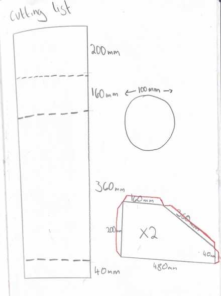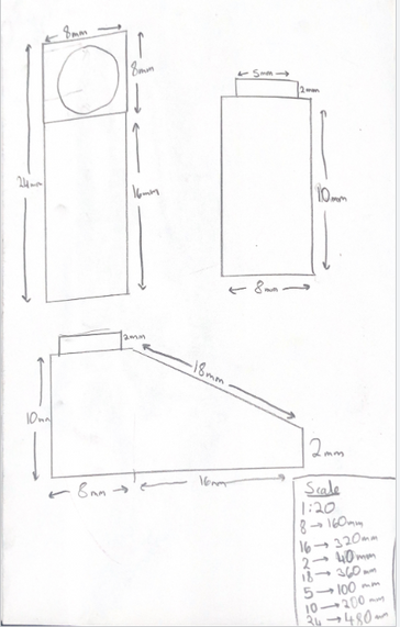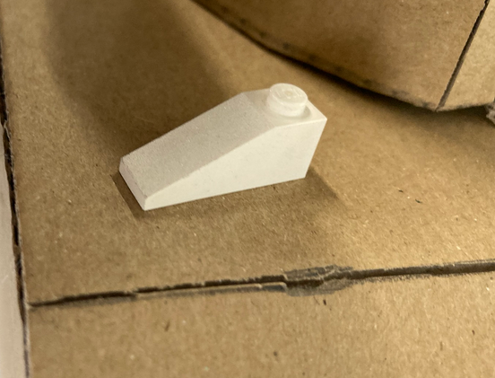 I began by taking measurements of my lego piece and increasing the scale 1:20. I decided on this scale because it would allow me to constuct the piece with more ease as it would be larger. I then made a cutting list of pieces, deciding to do the one long piece for the top, back and front and using scoring to make the bends. For the side pieces, I added tabs to connect them
