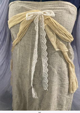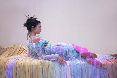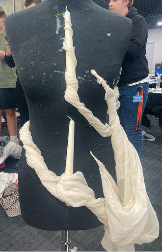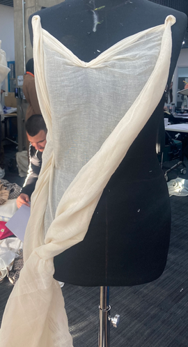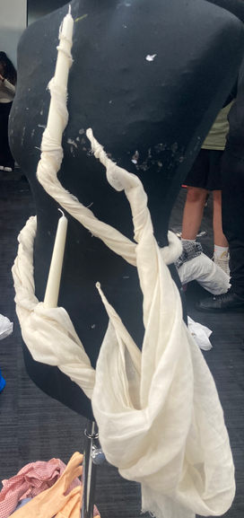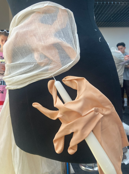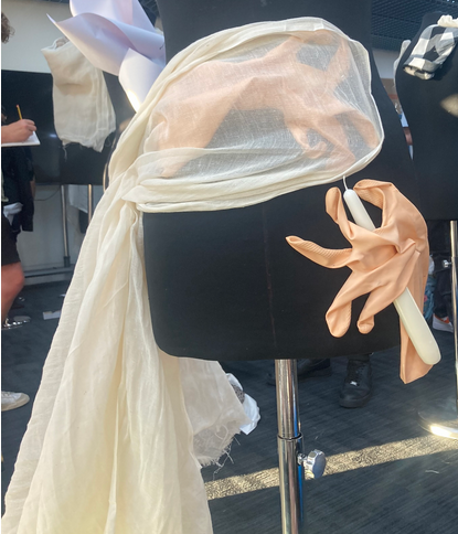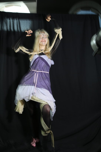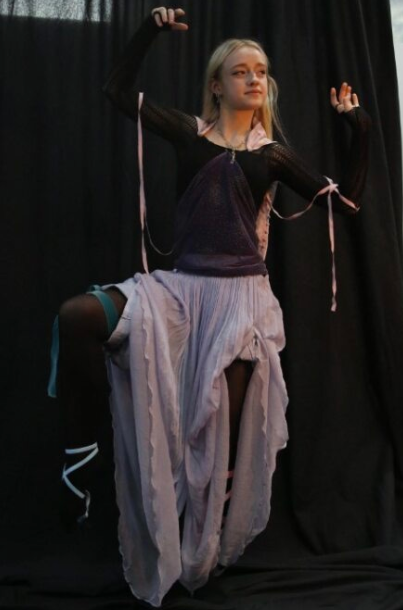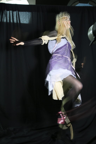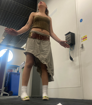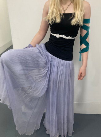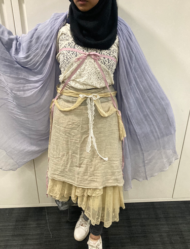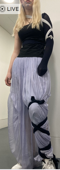 I took inspiration from the styles worn to modern day raves, with layered criss-crossing fabrics to incorporate the concept of subcultures as a place of freedom. I also took inspiration fromm the way LEMON.H used tights in unconventional ways.