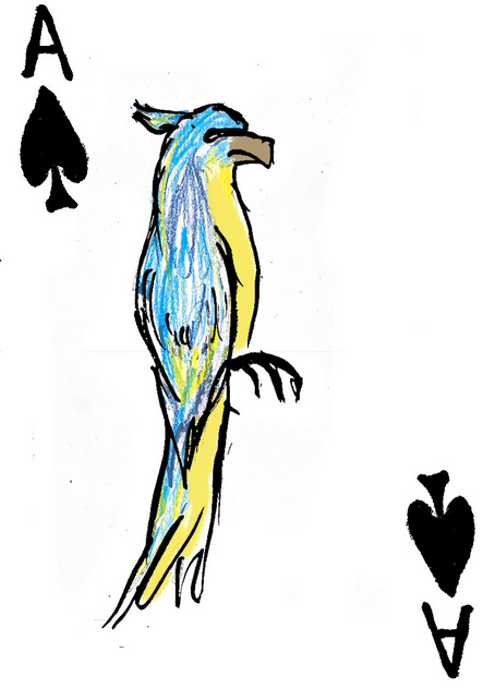 I like how the ace of spades cards always stand ou from the rest of the deck so for my deck I wanted the design of the card to be slightly different from the other cards but still refference the film. I wanted it to be a symbol in the film that fans of the movie would recognise and appriciate. This led me to choose the blue and yellow parrot that appears in one of the scenes. I liked how it could still fit the coulour sceme of the cards while standing out from them.
