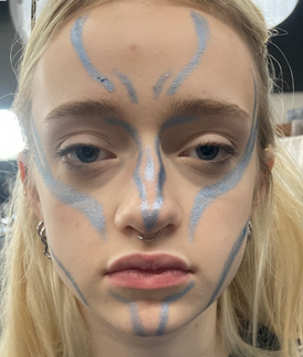 I took inspiration from makeup of Sue Catwoman, following the contours of the face to draw upon the fact that the changeling would have been part of the fairy worl if it had been wanted. This first design had too much detail which ended up looking too celestial, so for the photoshoot I choose the simpiler, blue design as it appeared more fae.