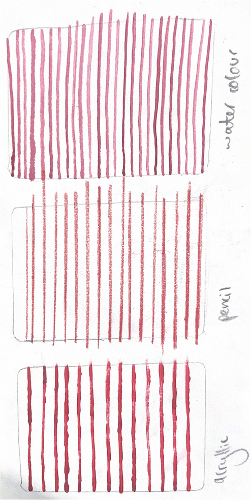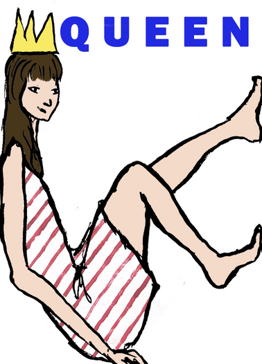 I decided to use a similar technique to Lauren Child to create the stiped dress Anna Karina’s character wears in th movie on my queen card. I wanted the patterns t be hand drawn to contrast with the block colours in the rest of the cards. I created the stripes with acrylic paint, pencil and watercolour to see whuich medium would be most appropriate. I chos ethe acrylic because I liked the messier effect it created.