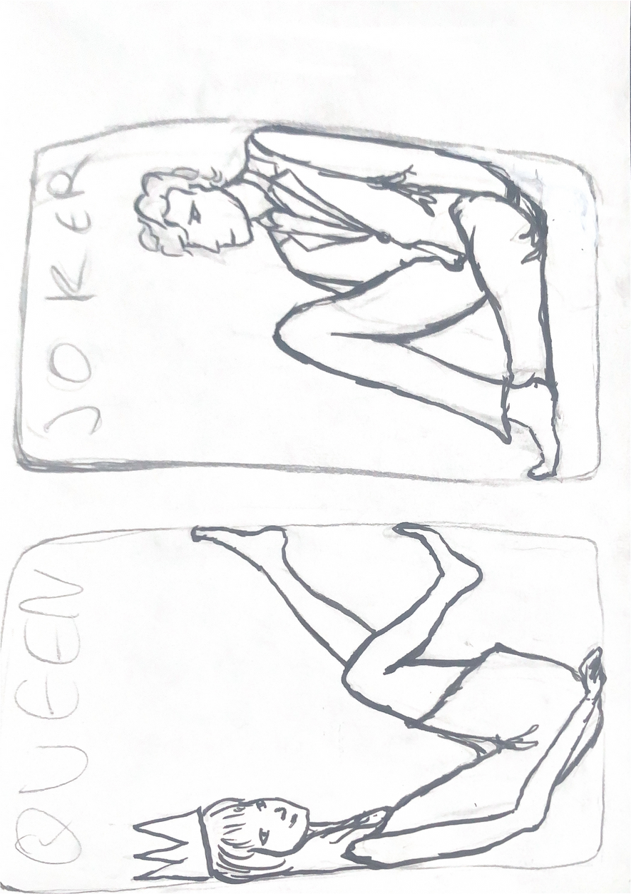 I was originally interested in the idea of a person sitting within the card frame and decided to use this for the queen card because the confidence and comfort of the pose matched the personality of the charcter that I was using to depict the queen.