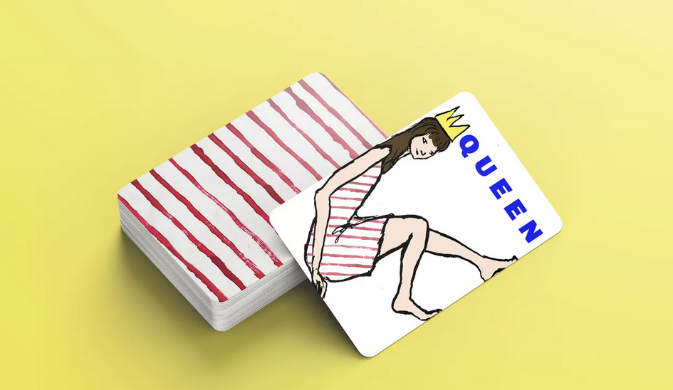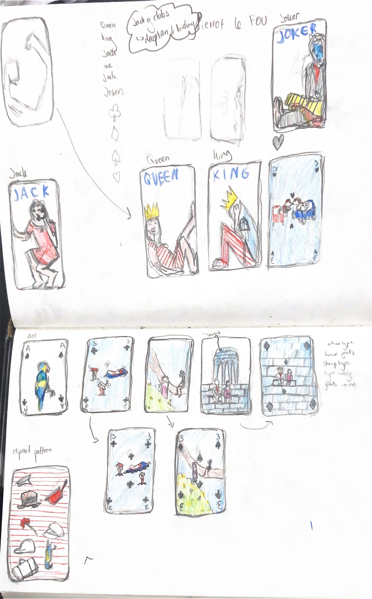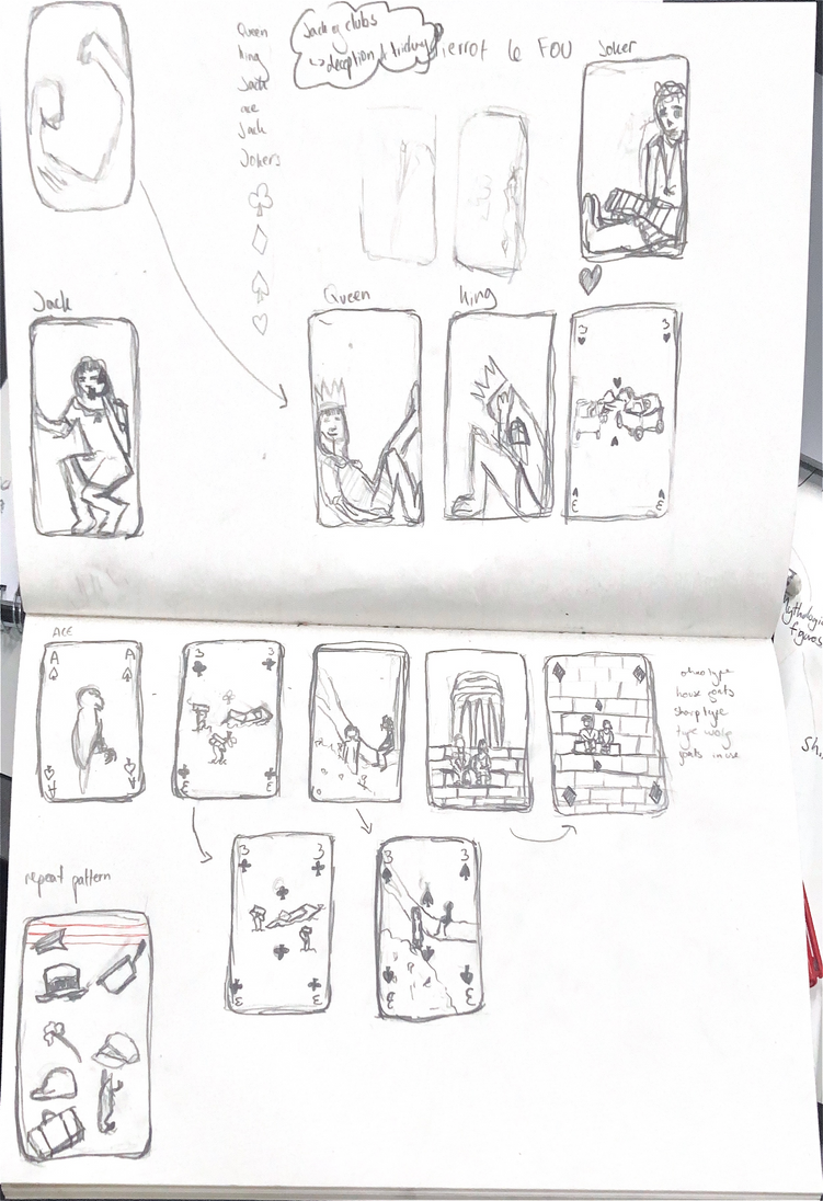 To improve the card deck I think I could have incorporated some aspect of photography into the cards in a similar way that added the handpainted stripes to the dress. I think this could have made the cards more dynamic as some of them, especially the regular deck cards looked a bit flat as a result of onl using block colours with the brush tool on photoshop. I also could improve the uniformity of the scale of my drawings as the Queen is larger than the other character cards and doesn’t have as much negitive space as I wanted.
